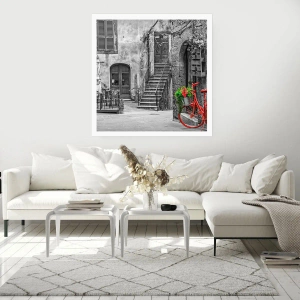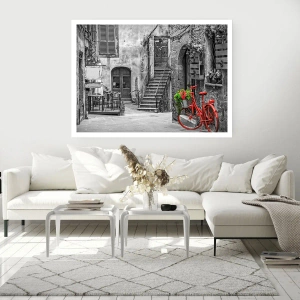 Poster - Ein rotes Fahrrad mit Blumen in einer engen Straße - 50x70cm - Toskanische Gasse - Moderne Wanddekoration für Wohnzimmer und Schlafzimmer ARTTOR