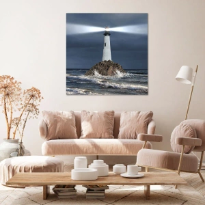 Der Mittelpunkt des Gemäldes ist ein hoher, weißer Leuchtturm, dessen Licht den dunklen Himmel erhellt und sich auf den Wellen spiegelt. Die Felsen, auf denen er steht, betonen seine Beständigkeit und Widerstandsfähigkeit gegen die Elemente der Natur. Die umgebende Leinwand zeigt schäumende Wellen, die der Komposition Dynamik und Bewegung verleihen und im Kontrast zur majestätischen Ruhe des Leuchtturms stehen.
