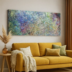 Die Leinwand wird über den Rahmen gespannt. Die Seiten und Kanten werden gedruckt, um das Bild fortzusetzen. Das Bild ist fertig zum Aufhängen an der Wand. Jedes Produkt hat einen am Rahmen befestigten Anhänger und ein Montageset (Schraube + Stift).