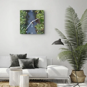 Wanduhr - Glasuhr - Ein Boot auf einem tropischen Fluss zwischen Palmen, aus der Vogelperspektive gesehen. - 30x30cm - Auf einem tropischen Pfad - Moderne Wanddekoration für Wohnzimmer, Küche und Schlafzimmer ARTTOR
