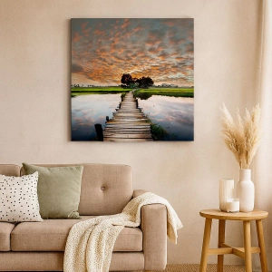 Die Leinwand wird über den Rahmen gespannt. Die Seiten und Kanten werden gedruckt, um das Bild fortzusetzen. Das Bild ist fertig zum Aufhängen an der Wand. Jedes Produkt hat einen am Rahmen befestigten Anhänger und ein Montageset (Schraube + Stift).