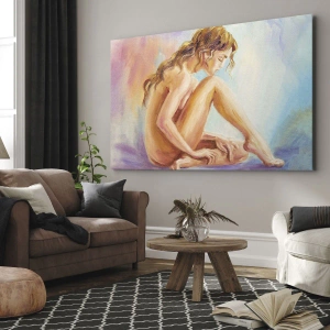 Bild auf Leinwand - Leinwandbild - Eine zarte Figur einer Frau auf einem pastellfarbenen Hintergrund - 70x50cm - Akt der Jugend - Moderne Wanddekoration für Wohnzimmer und Schlafzimmer ARTTOR