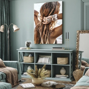 Die Leinwand wird über den Rahmen gespannt. Die Seiten und Kanten werden gedruckt, um das Bild fortzusetzen. Das Bild ist fertig zum Aufhängen an der Wand. Jedes Produkt hat einen am Rahmen befestigten Anhänger und ein Montageset (Schraube + Stift).