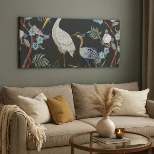 - Dieser Leinwanddruck zeigt gemalte Vögel, umgeben von Pflanzen vor einem dunklen Hintergrund. Dieses elegante Design, das an Natur und Harmonie erinnert, passt perfekt sowohl zu klassischen als auch zu modernen Inneneinrichtungen.