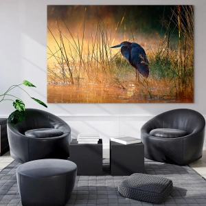 • Dieses Gemälde zeigt einen Reiher, der bei Sonnenuntergang an einem See steht. Perfekt für ein Büro oder Wohnzimmer.