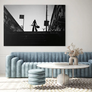 Glasbild - Bild auf glas - Schwarz-weiße Silhouette einer Frau vor dem Hintergrund einer Stadtlandschaft - 70x50cm - Städtisches Wandern - Moderne Wanddekoration für Wohnzimmer und Schlafzimmer ARTTOR