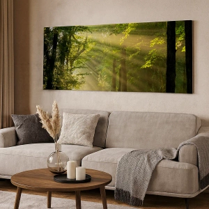 Waldmoment ist ein Leinwandbild, das eine malerische Waldlandschaft mit Sonnenlicht zeigt, das durch die Baumkronen scheint. Die Komposition voller Grün und Licht spiegelt die Harmonie und Schönheit der Natur wider und bringt Ruhe und Wärme in den Innenraum.