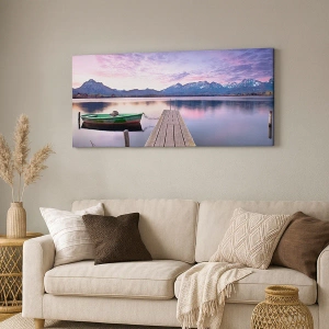 Freundliche Stille ist ein Leinwandbild, das eine malerische Ansicht eines Holzstegs mit Boot auf einem ruhigen See zeigt, der von majestätischen Bergen umgeben ist. Der Sonnenuntergang verleiht der Szene einen romantischen und entspannenden Charakter und bringt Harmonie und Wärme in den Innenraum.
