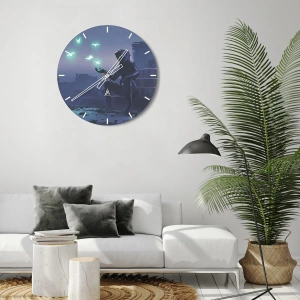 Das Motiv einer dunklen Gestalt und von Neonvögeln schafft eine Atmosphäre des Mysteriösen und Modernen, die perfekt zu Innenräumen im Loft-, Industrie- oder minimalistischen Stil passt. Die Uhr ist nicht nur ein praktisches Accessoire, sondern auch eine einzigartige Dekoration, die zum Blickfang des Raumes wird.