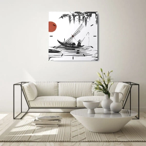 Wanduhr - Glasuhr - Orientalische Landschaft mit einem Fischer auf einem Boot und einer roten Sonne - 30x30cm - Asiatischer Nachmittag - Moderne Wanddekoration für Wohnzimmer und Schlafzimmer ARTTOR
