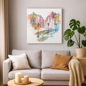 Bild auf Leinwand - Leinwandbild - Aquarell einer Brücke und herzförmigen Mietshäusern - 80x120cm - Das Herz der Stadt - Moderne Wanddekoration für Wohnzimmer und Schlafzimmer ARTTOR