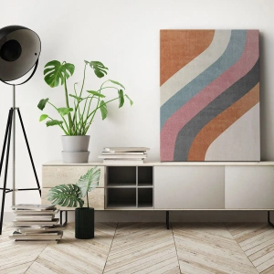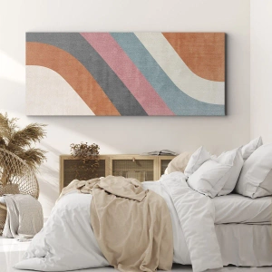 Der Leinwanddruck „Diagonale Komposition – Bewegung“ ist eine einzigartige Dekoration mit bunten Streifen im Retro-Stil. Seine geometrische Form und die leuchtenden Orange-, Pink- und Türkistöne verleihen ihm einen unverwechselbaren und dynamischen Charakter.