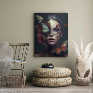 Bild auf Leinwand - Leinwandbild - Porträt einer Frau mit Schmetterlingen und Pflanzenelementen - 70x50cm - Wunderbare Metamorphose - Moderne Wanddekoration für Wohnzimmer und Schlafzimmer ARTTOR