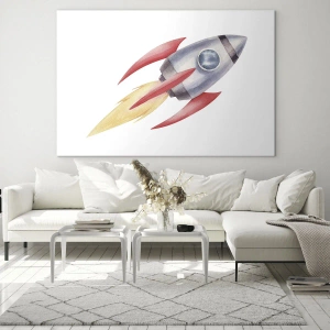Glasbild „Höher, schneller, weiter“ ist eine einzigartige Dekorationsidee, die modernes Design mit der Fantasie eines Kindes verbindet. Die grau-rot-gelbe Rakete in der Illustration schwebt im Raum und verleiht der Komposition eine dynamische und leichte Anmutung. Das gesamte Werk ist im Aquarellstil gestaltet, was dem Kunstwerk künstlerischen Charakter und Zartheit verleiht.