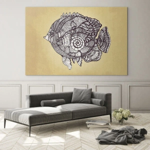 Wandbild – Aus dem Ozean der Ornamente – Cartoon-Fisch mit Ornamenten auf beigem Hintergrund