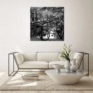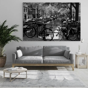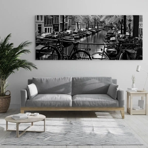 Glasbild - Bild auf glas - Schwarz-Weiß-Ansicht eines Kanals mit Fahrrädern und Booten - 70x50cm - Ein sehr holländischer Anblick - Moderne Wanddekoration für Wohnzimmer und Schlafzimmer ARTTOR