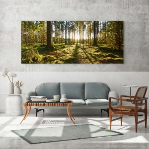 - Dieses 70 x 50 cm große Glasgemälde zeigt Sonnenlicht, das durch Waldbäume fällt. Perfekt für Innenräume, die ein Gefühl der Ruhe und Verbundenheit mit der Natur vermitteln.