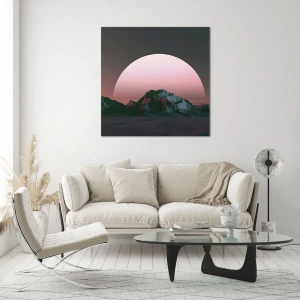 Glasbild - Bild auf glas - Abstrakte Landschaft mit geometrischen Bergen und einer rosa Sonne. - 70x50cm - In einer Nachbargalaxie - Moderne Wanddekoration für Wohnzimmer und Schlafzimmer ARTTOR