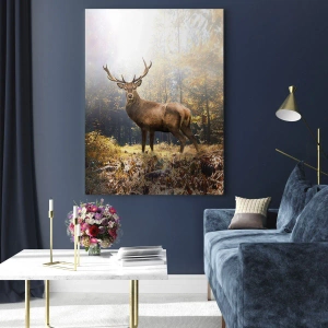 Das Foto fängt den Moment ein, in dem die Natur ihre Schönheit in ihrer ganzen Pracht offenbart. Die stattliche Silhouette des Hirsches, stark und selbstbewusst, strahlt Harmonie und natürliche Anmut aus. Die herbstliche Landschaft im Hintergrund, voller goldener und bernsteinfarbener Blätter, schafft eine unglaubliche Atmosphäre, die dem Innenraum Wärme und Tiefe verleiht.