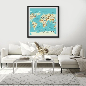 Poster in einem schwarzem Rahmen - Eine Weltkarte mit Abbildungen von Tieren in verschiedenen Regionen - 50x70cm - Gute Nachbarn - Moderne Wanddekoration für Wohnzimmer und Schlafzimmer ARTTOR