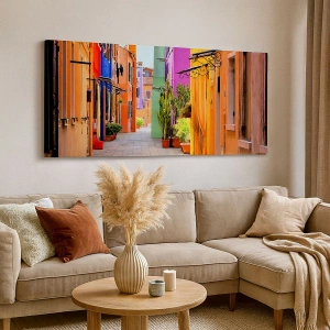 Das Leinwandbild "Bunte Straße im mediterranen Stil" ist eine malerische Darstellung voller Wärme und Gemütlichkeit. Die von bunten Mietshäusern in hellen Farbtönen gesäumte Straße strahlt Ruhe und Kleinstadtatmosphäre aus. Zusätzliche Details wie Blumentöpfe und dekorative Balustraden verleihen dem Bild einen einzigartigen Charakter und bringen Harmonie und Gemütlichkeit in den Innenraum.