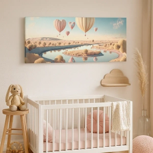 Das Motiv der herzförmigen Ballons symbolisiert Liebe, Freiheit und Abenteuer. Pastelltöne und zartes Helldunkel verleihen der Komposition eine subtile Note, während die malerische Landschaft ihre Harmonie und Ruhe unterstreicht. Es ist die perfekte Wahl für alle, die Wanddekorationen schätzen, die positive Energie und eine romantische Atmosphäre ins Interieur bringen.