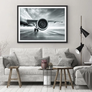 Poster in einem schwarzem Rahmen - Das Düsentriebwerk eines Flugzeugs auf dem Rollfeld - 70x50cm - Die Macht ist da! - Moderne Wanddekoration für Wohnzimmer und Schlafzimmer ARTTOR