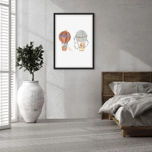 Die Komposition auf weißem Hintergrund macht die Illustration leicht und subtil, zieht aber gleichzeitig den Blick auf sich und erzeugt eine Atmosphäre aus Träumen und Abenteuer. Der bezaubernde Teddybär und der Elefant reisen in wunderschön dekorierten Ballons, was dem Ganzen eine einzigartige, magische Atmosphäre verleiht.