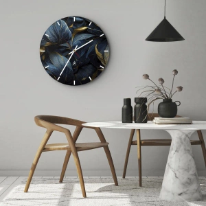 - Die Uhr zeigt eine elegante Komposition aus dunklen Blumen, verziert mit goldenen Linien. Die ausgewogene Kombination aus dunklen Tönen und einem Hauch von Gold setzt einen raffinierten dekorativen Akzent mit einer subtilen, luxuriösen Ästhetik.