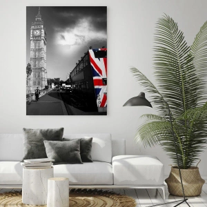 • Das Gemälde zeigt eine Schwarz-Weiß-Ansicht von Big Ben und einem Bus mit einer britischen Flagge. Die stimmungsvolle Szene verbindet klassische Architektur mit einem dynamischen zeitgenössischen Touch.
