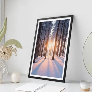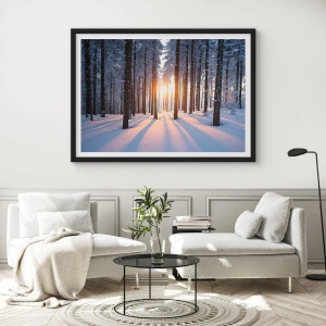 Poster in einem schwarzem Rahmen - Winterwald, beleuchtet von den Sonnenstrahlen - 70x50cm - Ganz klar schwarz auf weiß - Moderne Wanddekoration für Wohnzimmer und Schlafzimmer ARTTOR