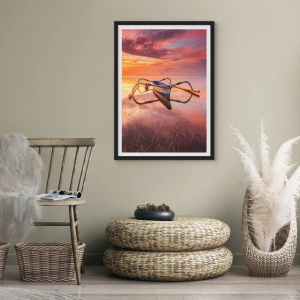 Poster in einem schwarzem Rahmen - Ein Boot auf ruhigem Wasser bei Sonnenuntergang - 70x50cm - Die Ruhe eines tropischen Abends - Moderne Wanddekoration für Wohnzimmer und Schlafzimmer ARTTOR