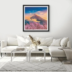 Poster in einem schwarzem Rahmen - Der Fuji, umgeben von Kirschblüten bei Sonnenuntergang - 50x70cm - Japanische Heiligkeit - Moderne Wanddekoration für Wohnzimmer und Schlafzimmer ARTTOR