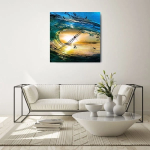 Wanduhr - Glasuhr - Meereswelle im Licht der untergehenden Sonne - 30x30cm - In einem smaragd-goldenen Kristall - Moderne Wanddekoration für Wohnzimmer, Küche und Schlafzimmer ARTTOR
