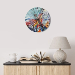 Eine Wanduhr mit einzigartigem Design, das ein abstraktes Schmetterlingsmotiv in intensiven, lebendigen Farben darstellt. Dieses künstlerische Dekorationselement verleiht dem Interieur Energie und einen einzigartigen Charakter und macht es ausdrucksvoller und einzigartiger.
