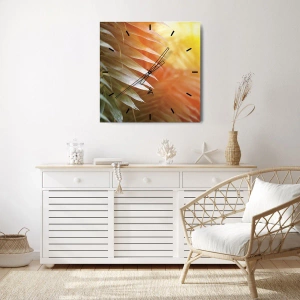 Wanduhr - Glasuhr - Eine Nahaufnahme von Palmblättern in warmen Orangetönen. - 30x30cm - Morgen im Dschungel - Moderne Wanddekoration für Wohnzimmer, Küche und Schlafzimmer ARTTOR