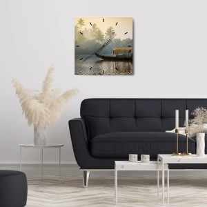Hochwertiger Druck und strapazierfähige Materialien sorgen für intensive Farben und langlebige Verarbeitung. Ein traditionelles Boot, ein ruhiger Fluss und tropische Palmen vereinen sich zu einer einzigartigen Wanduhr, die Ihrem Interieur Ruhe, Harmonie und exotischen Charme verleiht.