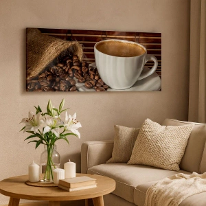 Bild auf Leinwand - Leinwandbild - Eine Tasse Kaffee mit Bohnen auf Bambus-Hintergrund - 50x70cm - Die Schwärze von Kohle, die Klarheit von Bernstein - Moderne Wanddekoration für Wohnzimmer und Schlafzimmer ARTTOR