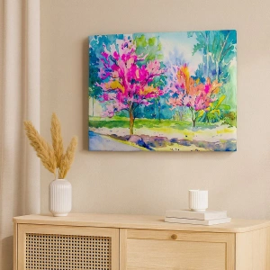 Bild auf Leinwand - Leinwandbild - Bunte Bäume in einem Park im Aquarellstil - 50x70cm - Regenbogengarten im Frühlingslicht - Moderne Wanddekoration für Wohnzimmer und Schlafzimmer ARTTOR