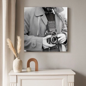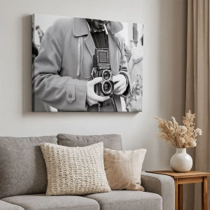 Bild auf Leinwand - Leinwandbild - Schwarz-Weiß-Foto eines Mannes mit einer Retro-Kamera - 50x70cm - Retro-Stil - Moderne Wanddekoration für Wohnzimmer und Schlafzimmer ARTTOR