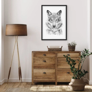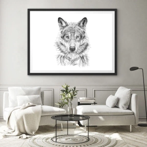 Poster in einem schwarzem Rahmen - Detaillierte Zeichnung eines Wolfes im Schwarz-Weiß-Stil - 50x70cm - Ein geborener Anführer - Moderne Wanddekoration für Wohnzimmer und Schlafzimmer ARTTOR