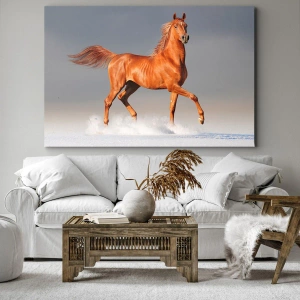 Dieses Gemälde ist eine ausgezeichnete Wahl für alle, die Minimalismus und Eleganz schätzen. Die Bewegung des galoppierenden Pferdes wurde mit unglaublicher Präzision dargestellt, was dem Werk einen realistischen Charakter verleiht. Der Kontrast zwischen der warmen Farbe des Pferdes und dem kühlen Farbton des Himmels unterstreicht die Tiefe und Dynamik der Komposition zusätzlich.