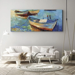 - Ein Gemälde, das bunte Boote zeigt, die auf ruhigem Wasser vor Anker liegen, perfekt für Innenräume, die von Natur und Harmonie inspiriert sind.