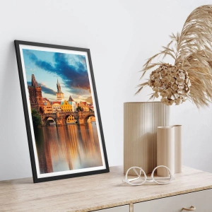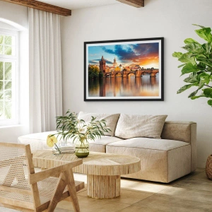 Poster in einem schwarzem Rahmen - Die historische Brücke über den Fluss im Licht der untergehenden Sonne - 70x50cm - Schön seit Ewigkeiten - Moderne Wanddekoration für Wohnzimmer und Schlafzimmer ARTTOR