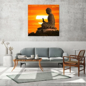 Glasbild - Bild auf glas - Buddha-Statue vor dem Hintergrund der untergehenden Sonne - 70x50cm - Keine Angst vor der Welt - Moderne Wanddekoration für Wohnzimmer und Schlafzimmer ARTTOR