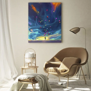 Glasbild - Bild auf glas - Eine Person hält bunte Luftballons vor einem blauen Windhintergrund. - 50x70cm - Zum blauen Wind - Moderne Wanddekoration für Wohnzimmer und Schlafzimmer ARTTOR