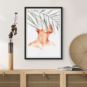 Poster in einem schwarzem Rahmen - Aquarellfrau mit Palmblättern, die ihr Gesicht bedecken - 50x70cm - Spüre den Puls der Tropen - Moderne Wanddekoration für Wohnzimmer und Schlafzimmer ARTTOR
