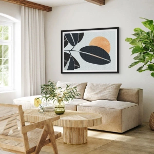 - Ein minimalistisches Poster mit schwarzen Blättern vor einer warmen Sonne. Eine moderne Komposition, die perfekt zu eleganten Innenräumen passt.