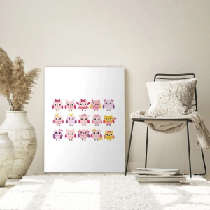 - Das Gemälde zeigt eine Sammlung bunter Eulen in verschiedenen Mustern, die auf weißem Hintergrund ein fröhliches Motiv bilden, das perfekt für ein Kinderzimmer geeignet ist.