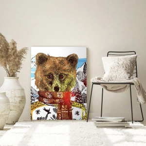 - Ein Bär mit verziertem Pullover und Schal vor einer malerischen Winterlandschaft mit Berghütte. Diese Illustration ist im künstlerischen Stil gehalten und eignet sich perfekt für die Inneneinrichtung.